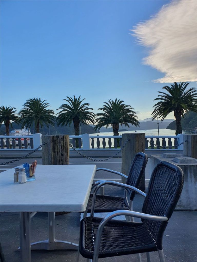 Färjan skulle avgå klockan 14 på måndagen (dagen efter vi kom till Picton) så på måndagmorgon åt vi frukost vid stranden och sen gick vi runt igen i Picton, haha. Vi gick på en 10 minuters promenad till en lookout, och den var väl hel OK. Inget jag skulle hänga i granen, men men!